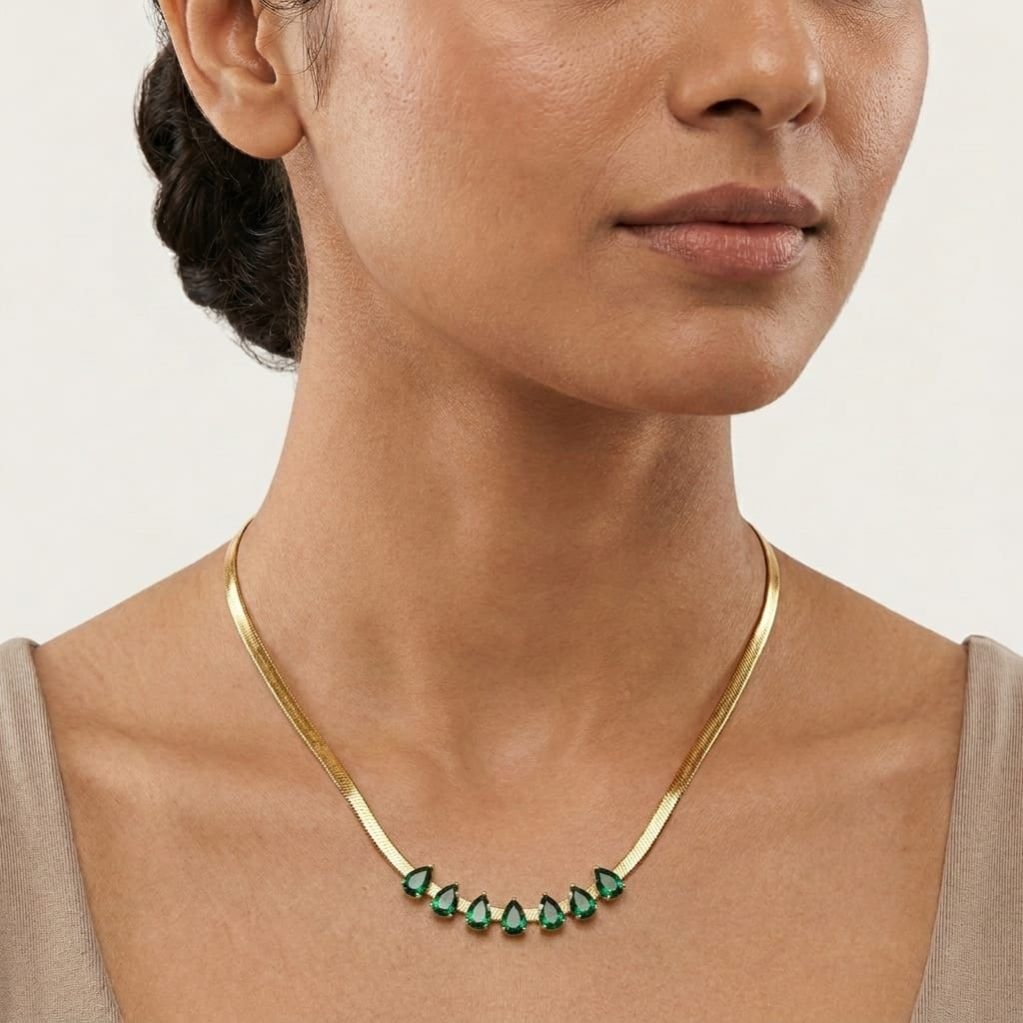 A sleek gold herringbone chain adorned with rich emerald teardrop stones for a bold, elegant finish.