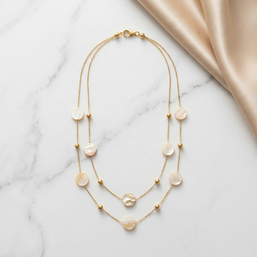 A delicate layered gold chain adorned with soft, luminous shell pearls for an elegant and graceful look.