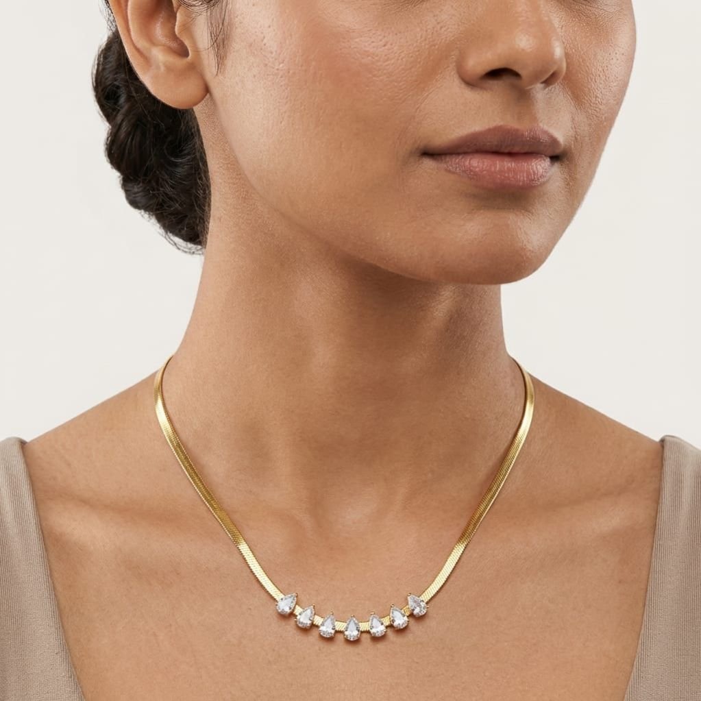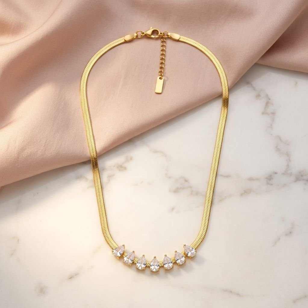 A sleek gold herringbone chain adorned with sparkling teardrop crystals for a refined statement look.