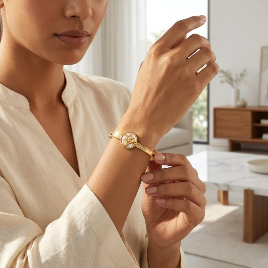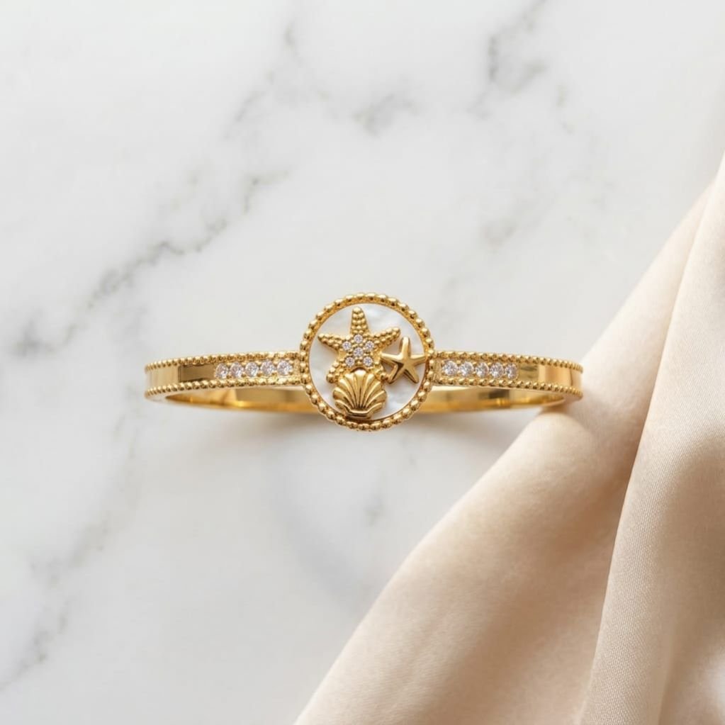 A stunning gold-plated bracelet inspired by the beauty of the sea, featuring intricately designed starfish and seashell motifs at its center. Adorned with fine crystal accents along the band, this piece blends elegance with a playful coastal charm. The sleek, polished finish ensures a luxurious look, making it perfect for both everyday wear and special occasions. Lightweight yet durable, it offers a comfortable fit while adding a subtle sparkle to your style. Ideal for those who love unique, ocean-inspired jewelry with a modern, premium touch.