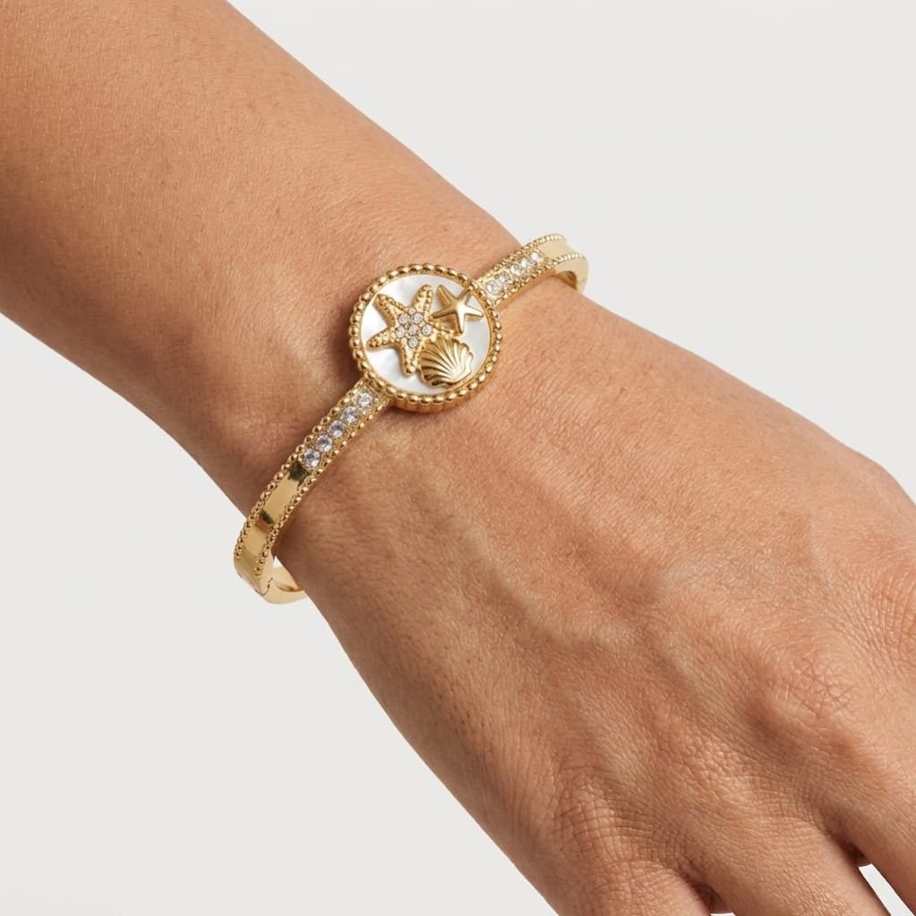 A beautifully crafted gold bracelet featuring delicate starfish and seashell charms, accented with subtle sparkle. Inspired by the elegance of the ocean, it adds a touch of coastal luxury to any look.