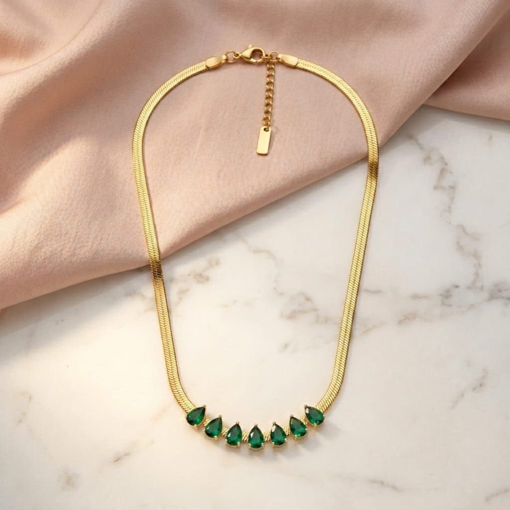 A sleek gold herringbone chain adorned with rich emerald teardrop stones for a bold, elegant finish.