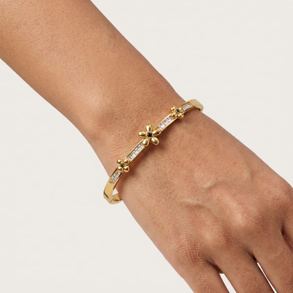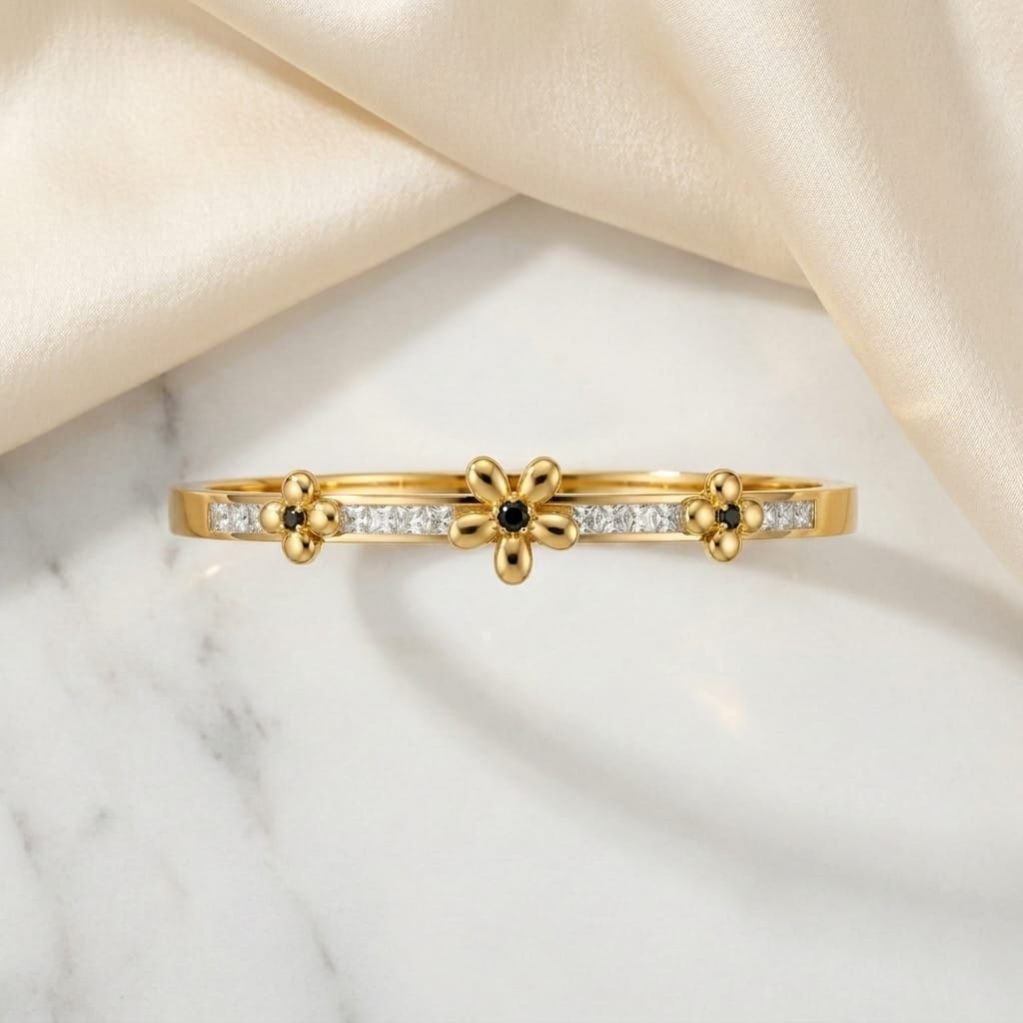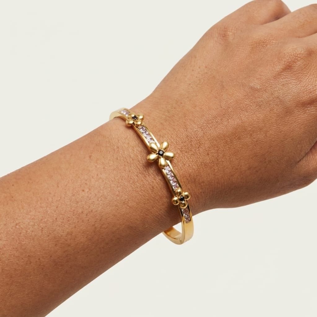 A graceful gold bracelet adorned with delicate floral motifs and sparkling accents, adding a touch of elegance and charm.