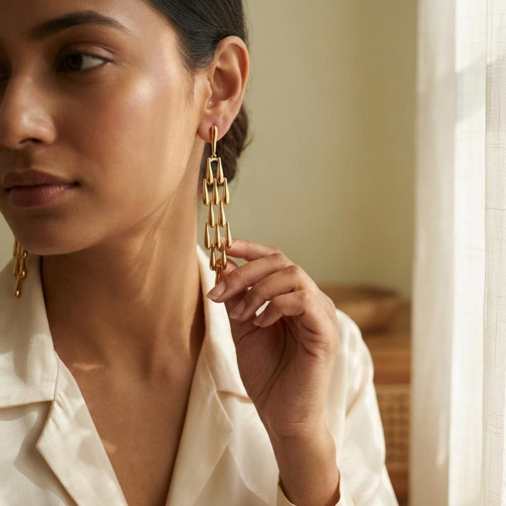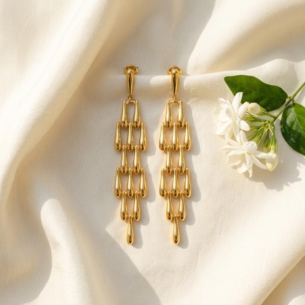 Make a striking impression with the Golden Cascade Statement Earrings, designed to elevate your style effortlessly. Featuring a unique layered drop pattern with smooth, polished gold elements, these earrings create a fluid cascading effect that catches the light beautifully. Their bold yet elegant structure adds a contemporary edge, making them ideal for parties, evening wear, or standout daytime looks. Lightweight and comfortable, they offer the perfect balance of statement design and wearable luxury for the modern woman.