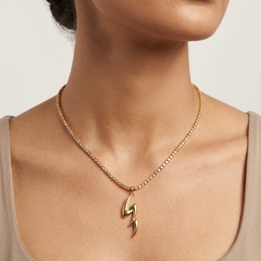 A sleek tennis-style chain paired with a bold lightning-shaped pendant for a modern, edgy look.
