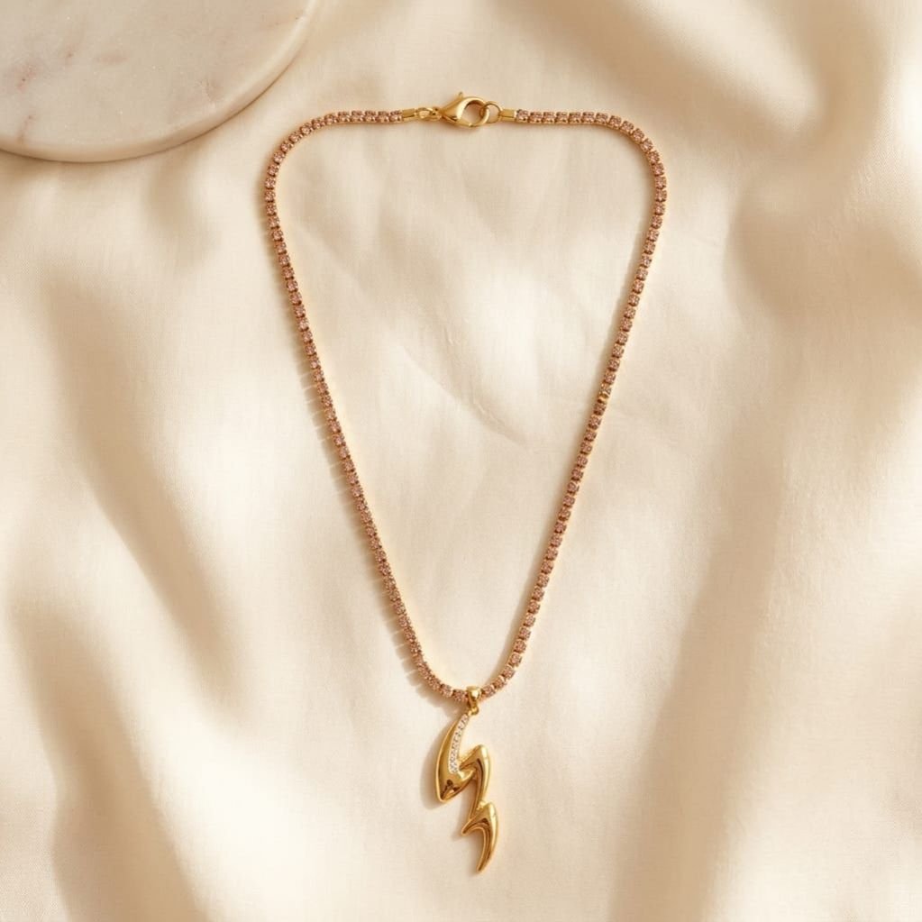 Make a striking statement with the Lightning Luxe Pendant Necklace, designed for those who love bold elegance. Featuring a refined tennis-style chain adorned with shimmering stones, this piece is elevated by a sculpted lightning-shaped pendant that adds a dynamic, contemporary edge. The polished gold finish enhances its luxurious appeal, while the unique design brings a touch of power and individuality. Perfect for both day and night styling, this necklace blends modern sophistication with standout charm, making it a must-have for trend-forward jewelry lovers.