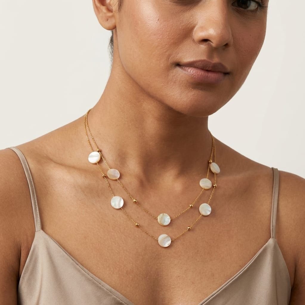 A delicate layered gold chain adorned with soft, luminous shell pearls for an elegant and graceful look.