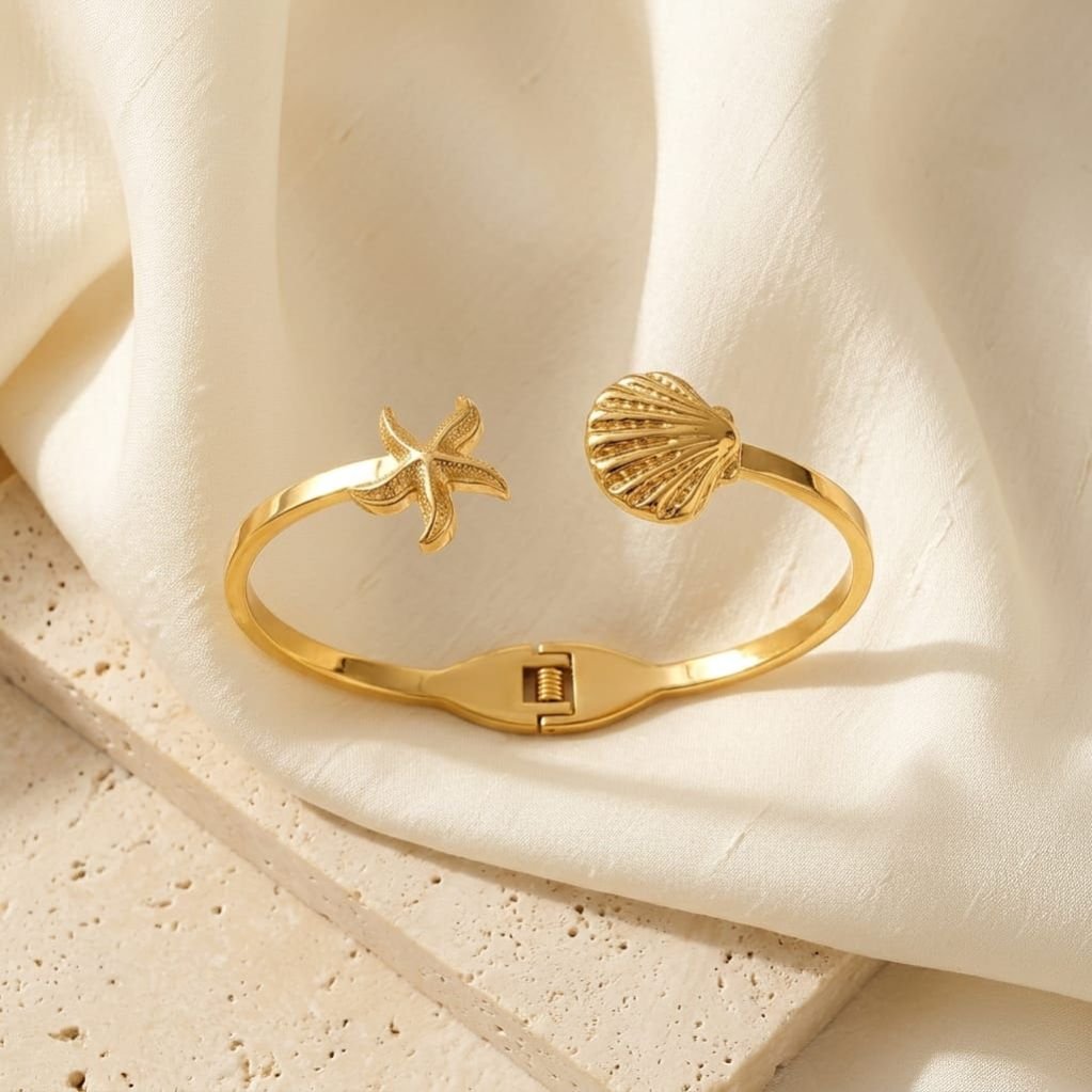 A chic gold open cuff bracelet featuring starfish and seashell motifs, inspired by the beauty of the ocean.